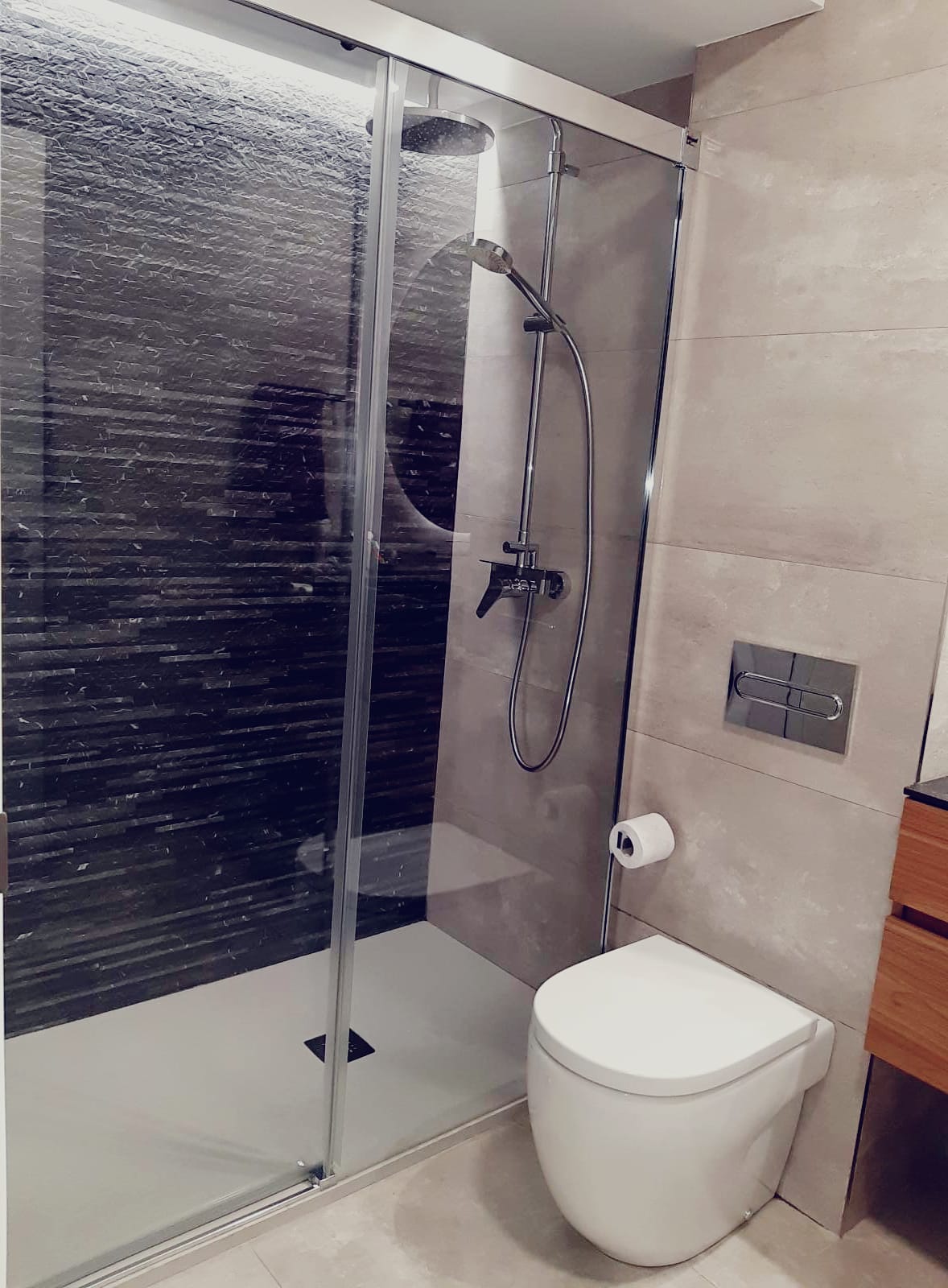 Inodoro modelo Meridian de Roca a suelo para tanque empotrable, con placa de accionamiento mod. PL1 dual de Roca en cromo brillo. Plato de ducha mod. Slate Acquabella. Columna ducha mod. Even MM de Roca con repisa portagel. Mampara ducha 1 fijo + 1 deslizante mod. Arredi de Nesguel perfil aluminio brillo/cristal transparente con tratamiento antical. Toallero-radiador CL50/80 blanco de Baxi. Espejo redondo diámetro 90cm. retroiluminado. Grifería mod. Loft de Tres Grifería. Portarrollos sin tapa y toallero de barra 40cm. mod. Nuova de Roca.