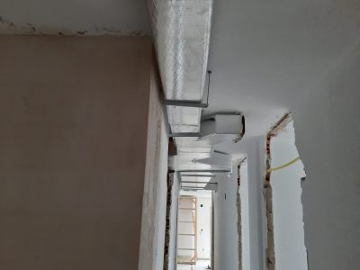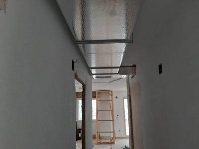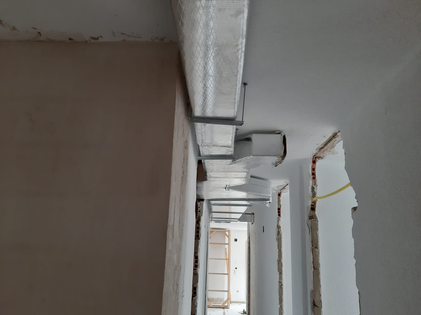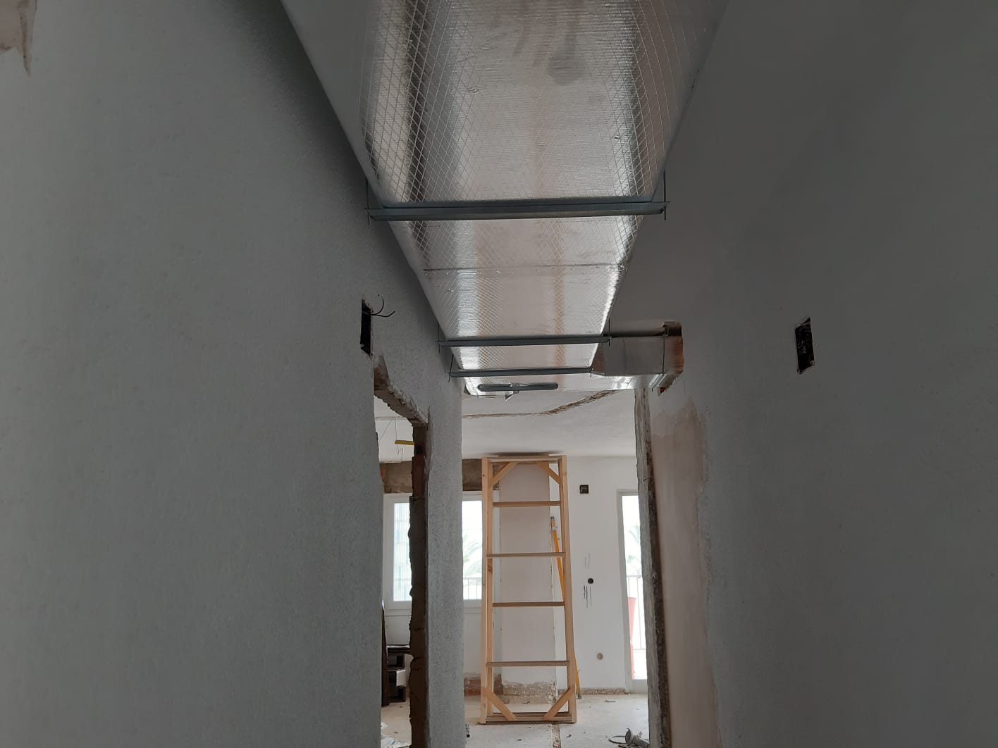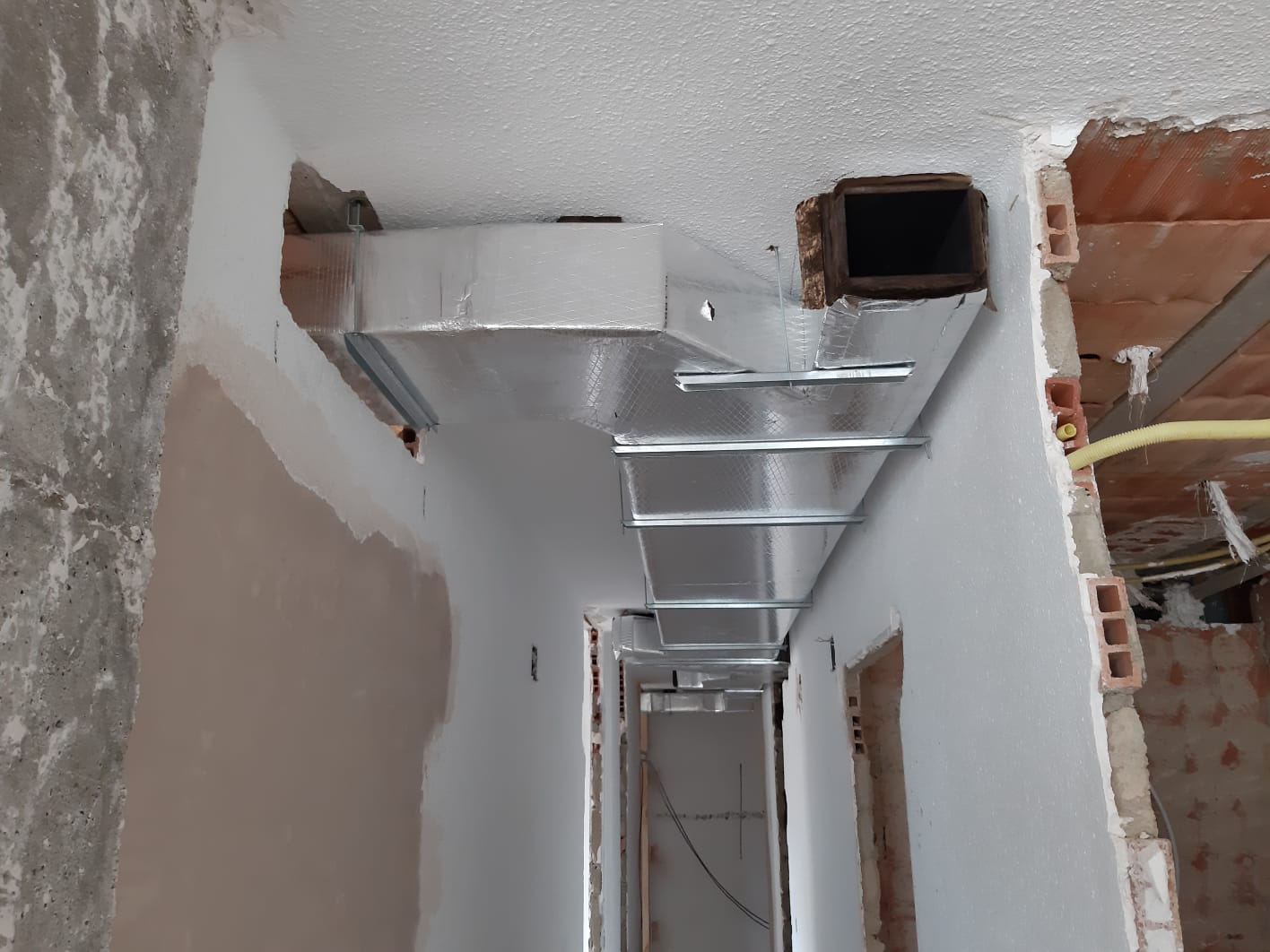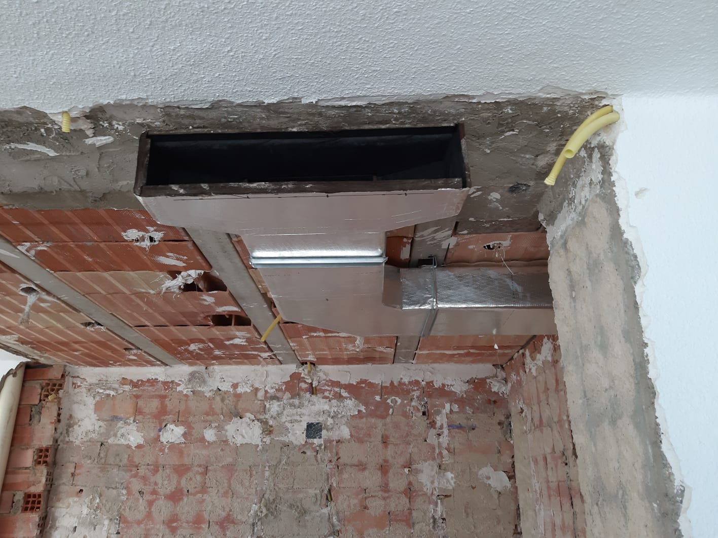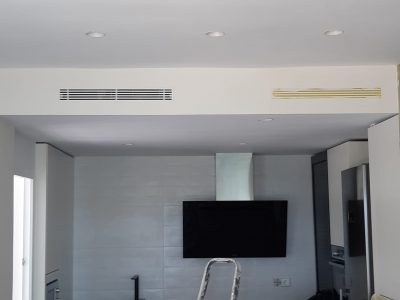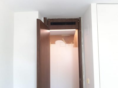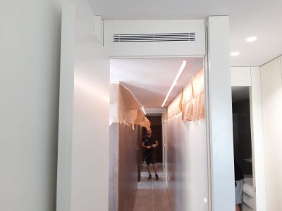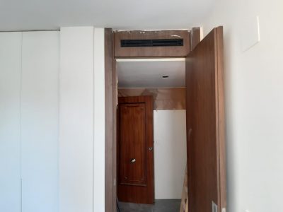 Apartamento en Benicassim. Instalación de maquina Mitsubitshi con expansión directa por conductos, inverter, integración de rejillas en parte superior de puertas, con el mismo acabado, consiguiendo así una estética uniforme y elegante.